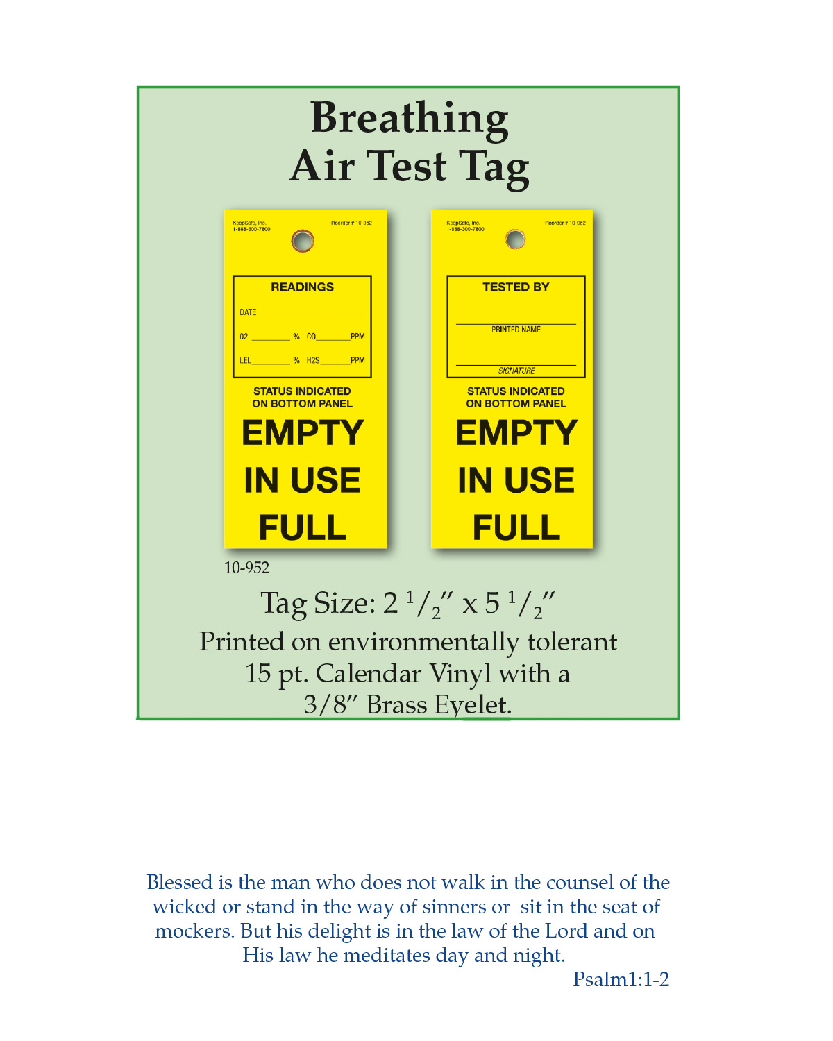 All tags are printed on environmentally tolerant 15 pt. calendar vinyl with a 3/8" brass eyelet unless otherwise noted.